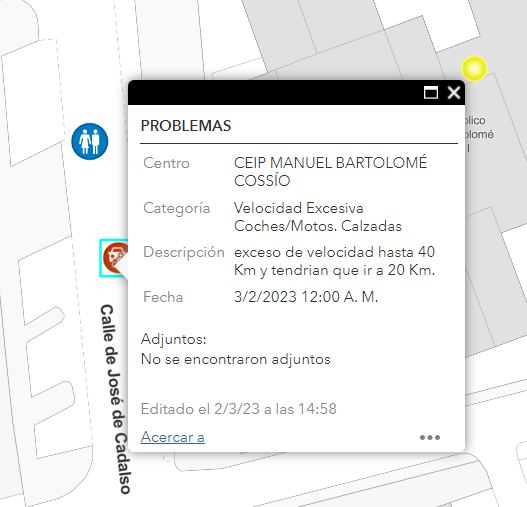 El curso pasado el comité medioambiental formado por alumnos y alumnas del CEIP Bartolomé Cossío hizo un diagnóstico de movilidad de la zona y una de las cosas que se registraron con los cazavelocidades era el exceso de velocidad en la calle de José de Cadalso, justo enfrente del colegio. En algunos casos, los vehículos circulaban a 40km/h en el tramo limitado a 20km/h. En el siguiente enlace dentro del programa STARS del Ayuntamiento está recogido.